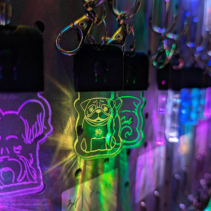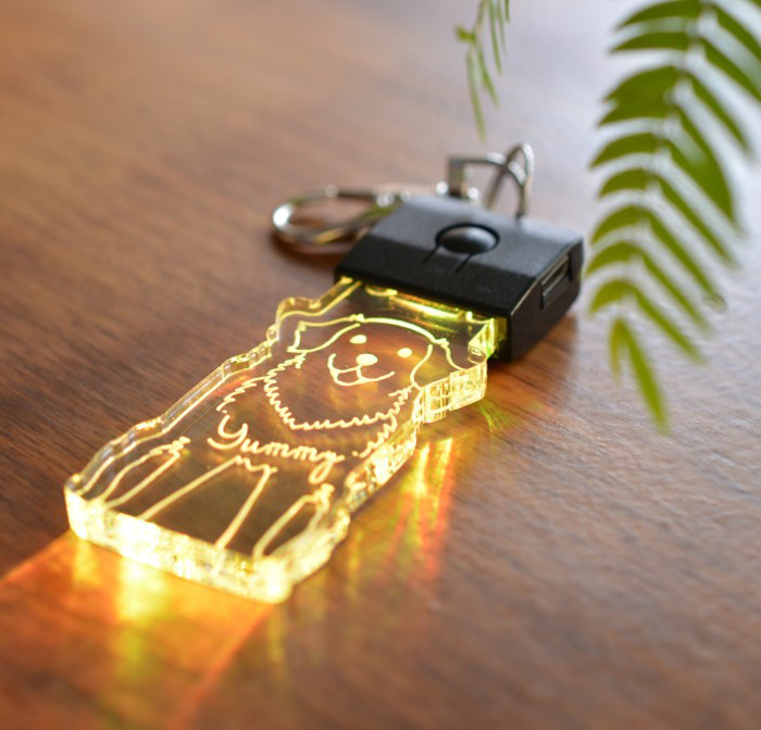 暗い時のお散歩に便利な光るお散歩チャームを販売します。犬種デザイン60犬種以上!新犬種も登場!その場でワンちゃんのお名前をレーザー刻印します。